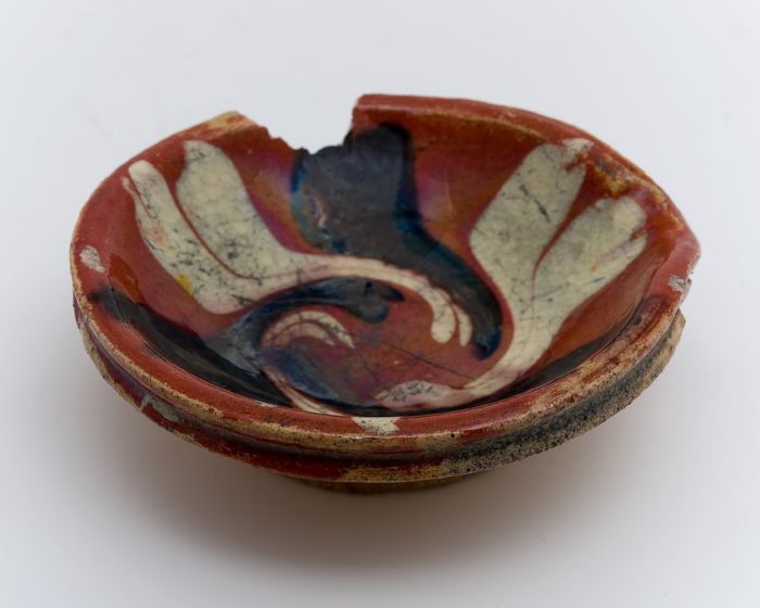 Aardewerk speelgoed schaal met schenklip, versierd i...