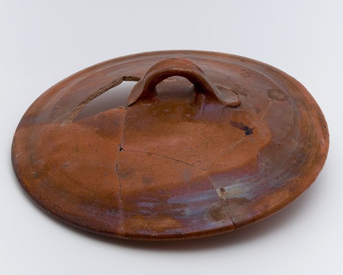 Aardewerk deksel, uitwendig geglazuurd, met breed oo...