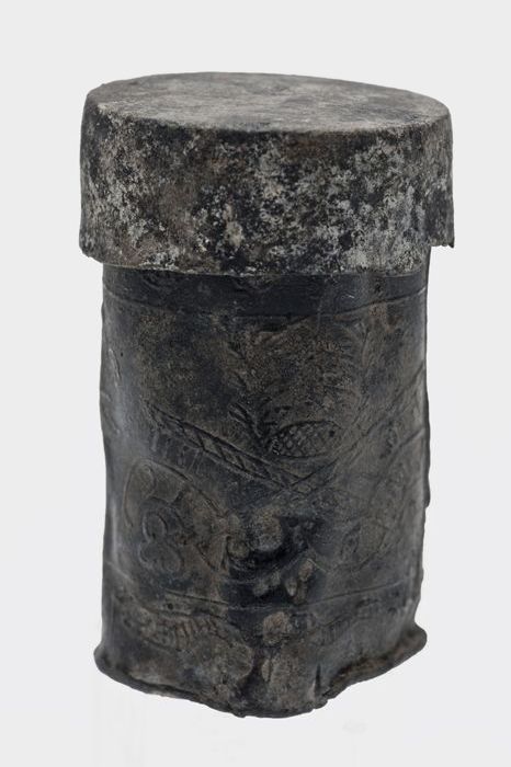 Kleine tinnen reliekhouder met deksel, versiering in...