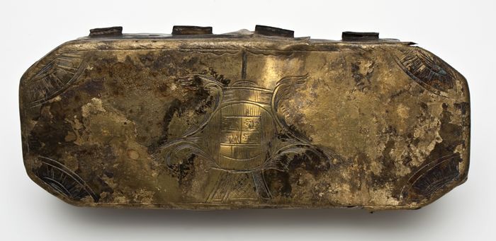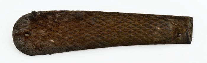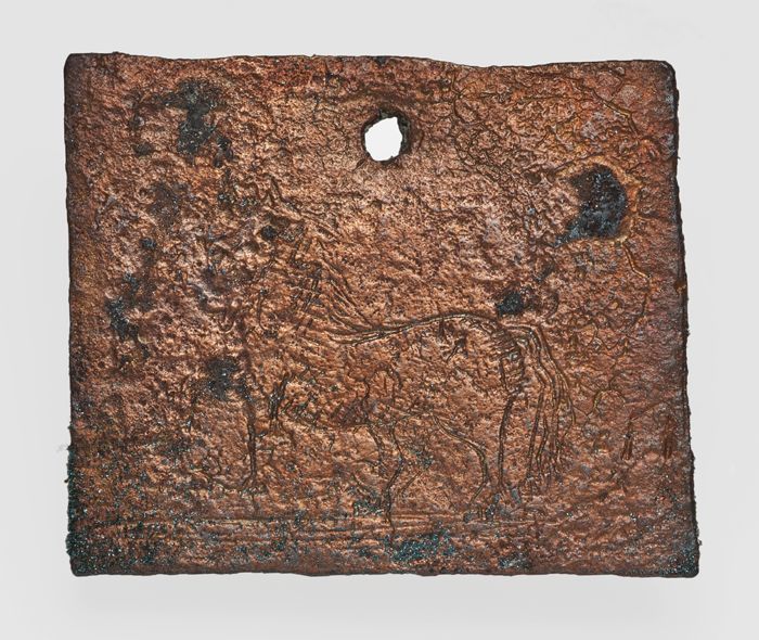 Roodkoperen beslag, versierd met gegraveerd paard