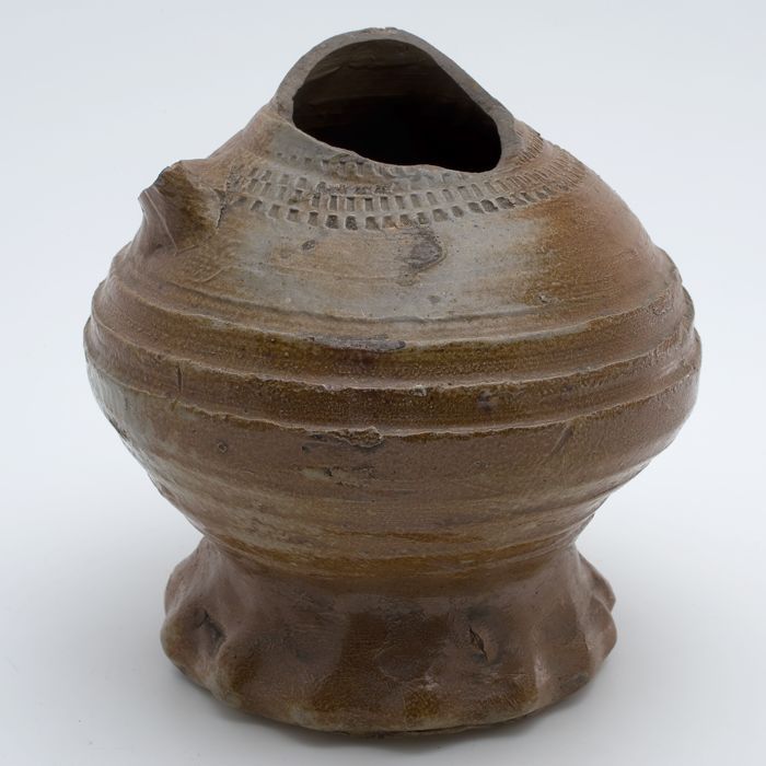 Steengoed kan met grijze en bruine kleur, op knijpvoet