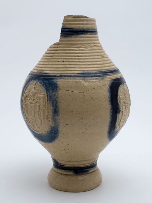 Steengoed kruik, versierd met blauwe medaillons, op ...