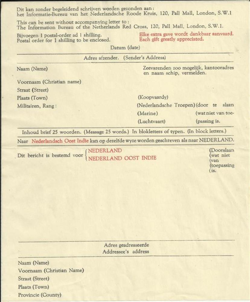 Formulier Roode Kruis , formulier om een brief te ve...