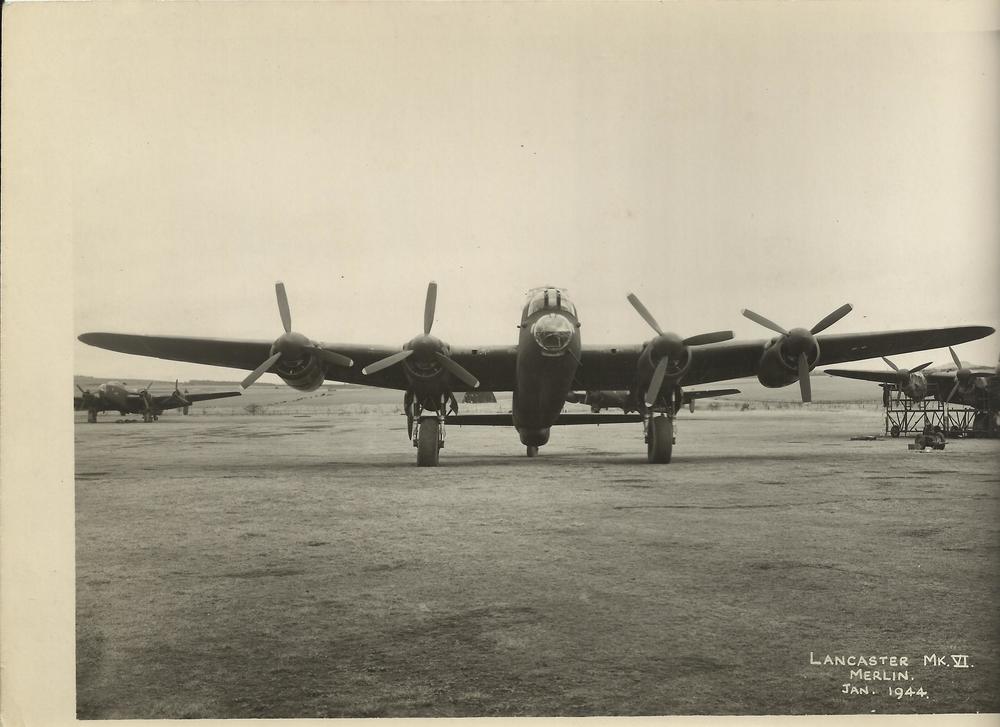 Briefkaart met foto van Avro Lancaster die over de D...