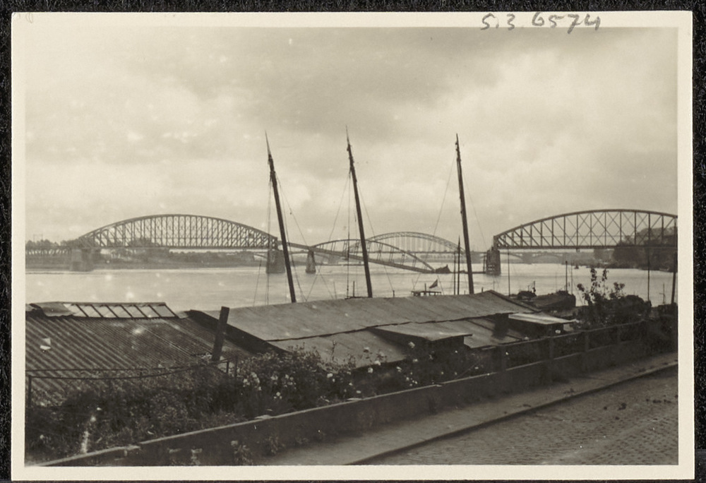 Foto: opgeblazen spoorbrug over Waal bij Nijmegen, 1...