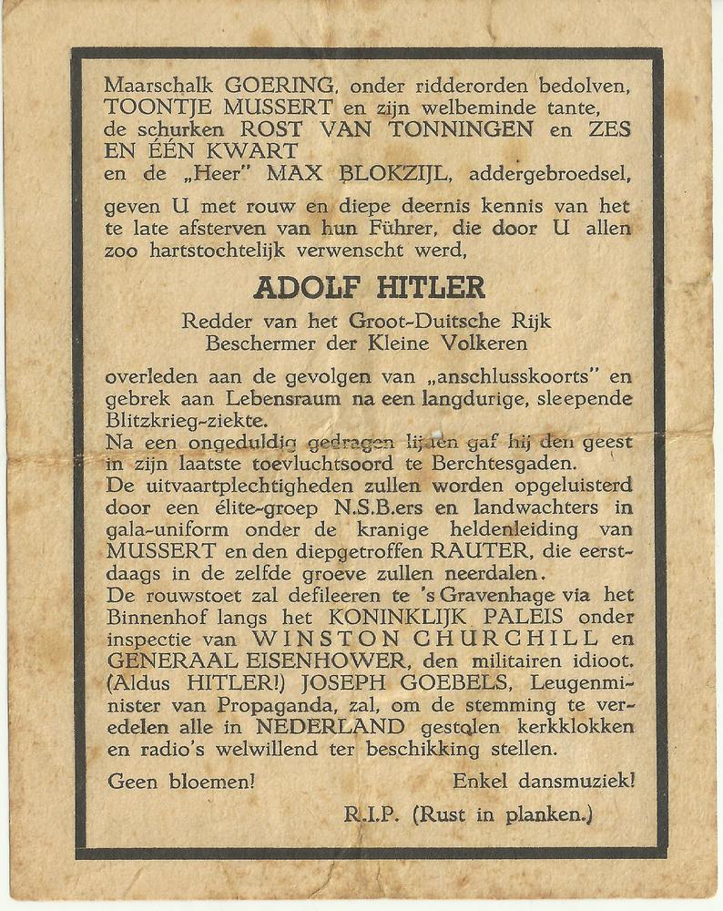 Overlijdensbericht Adolf Hitler spotprent