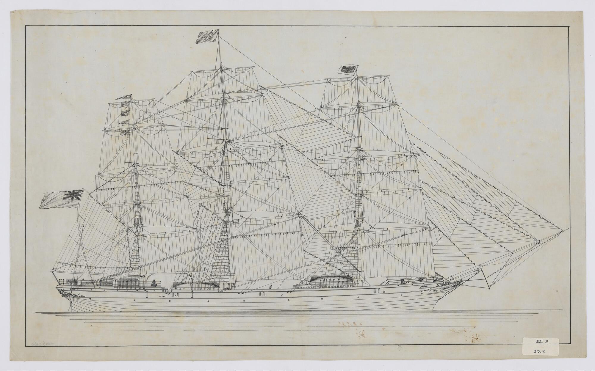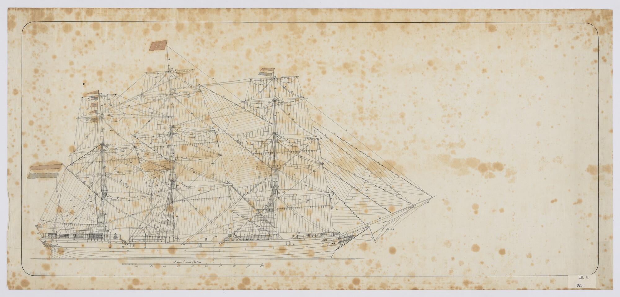 Zijaanzicht met zeilplan van het barkschip 'Nicolaas...