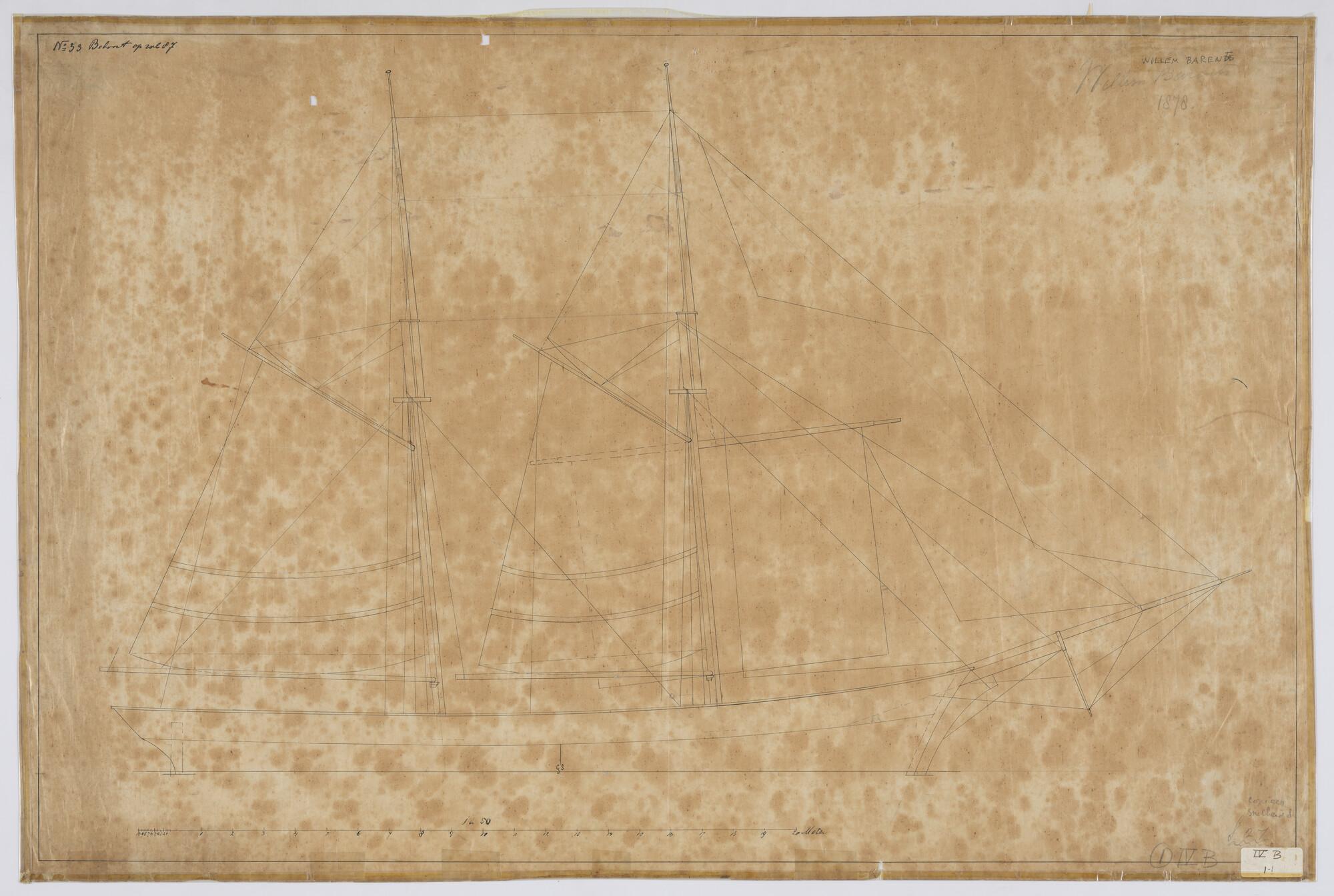 Zijaanzicht met zeilplan van de schoener Willem Barents