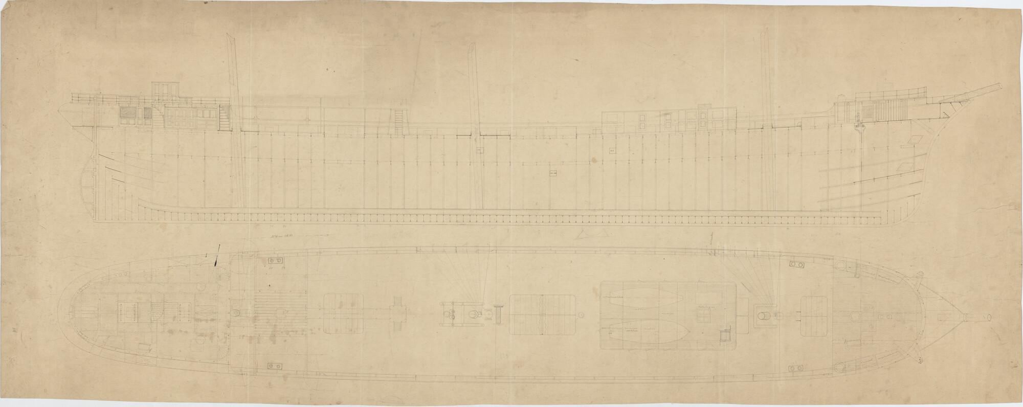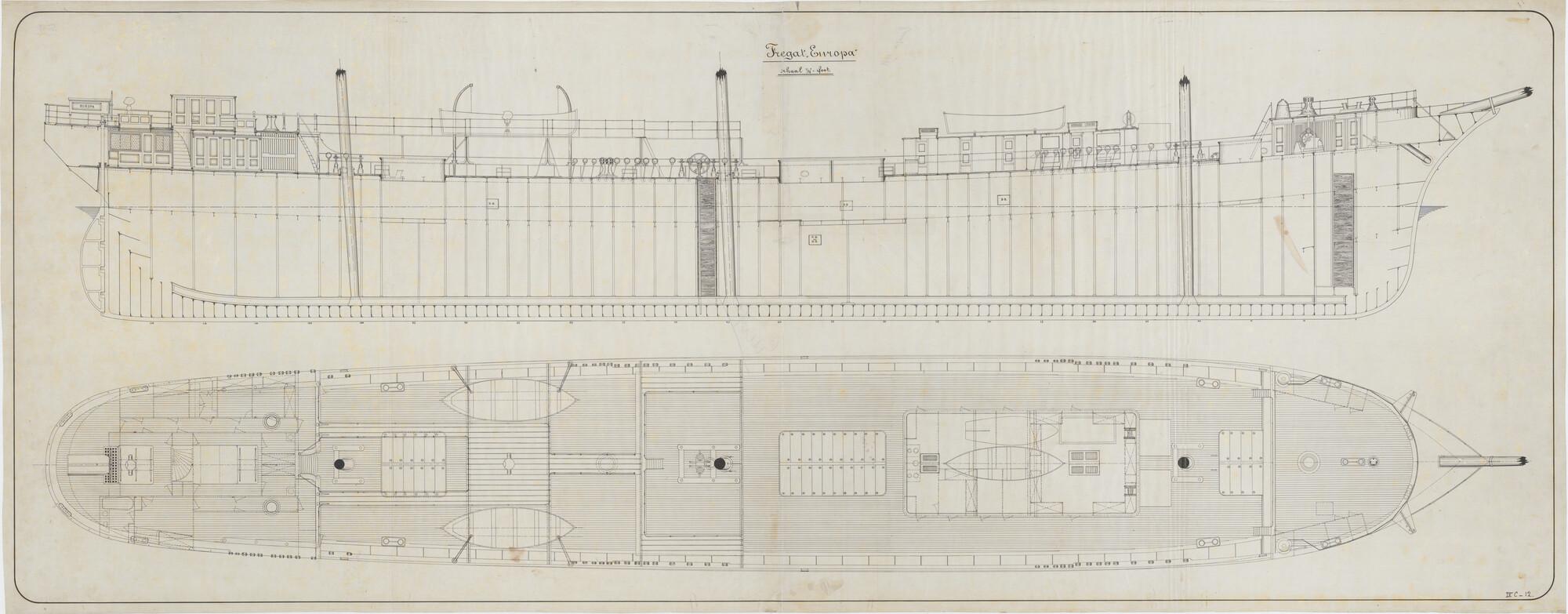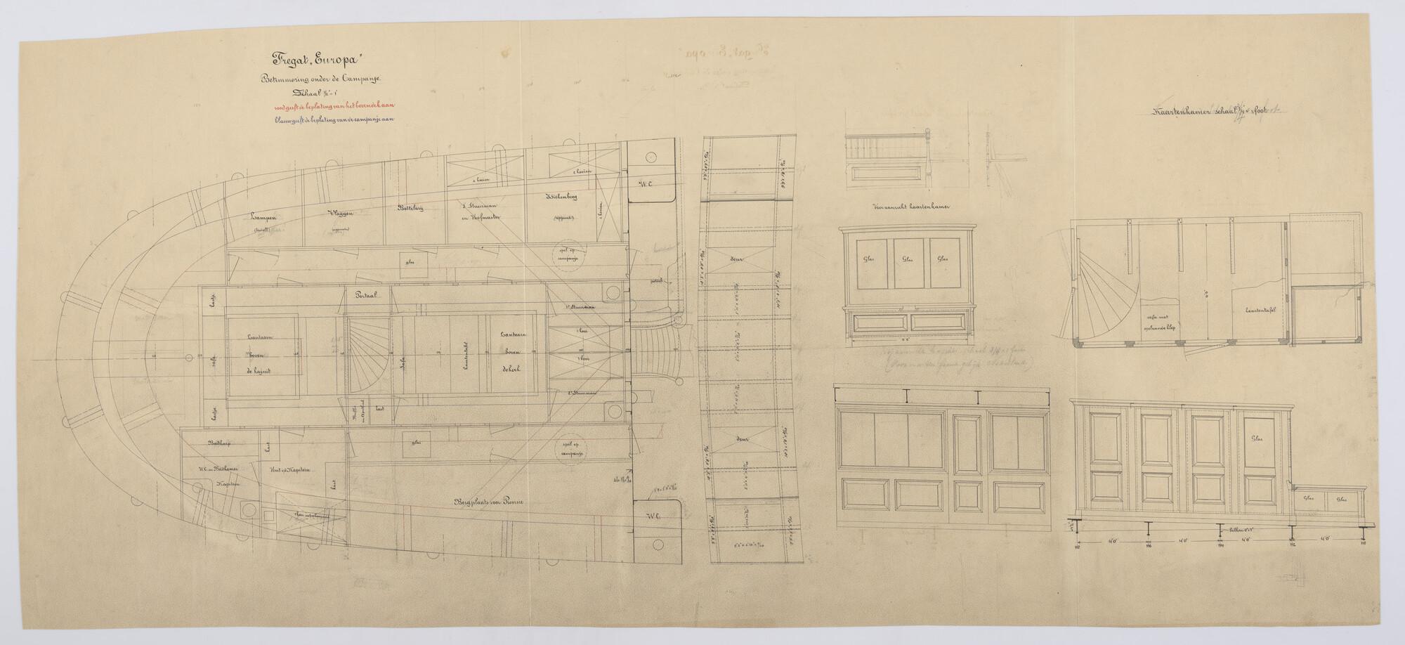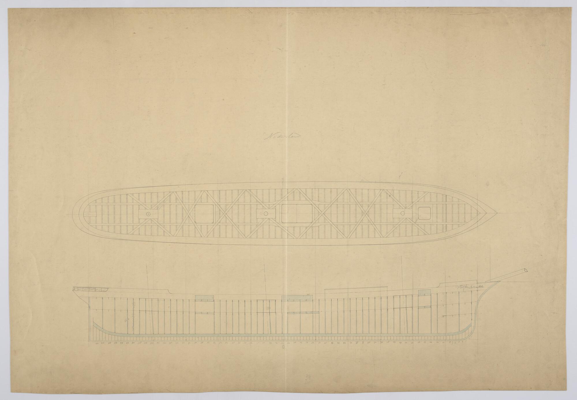 Verticale langsdoorsnede, bovendek van het fregatsch...