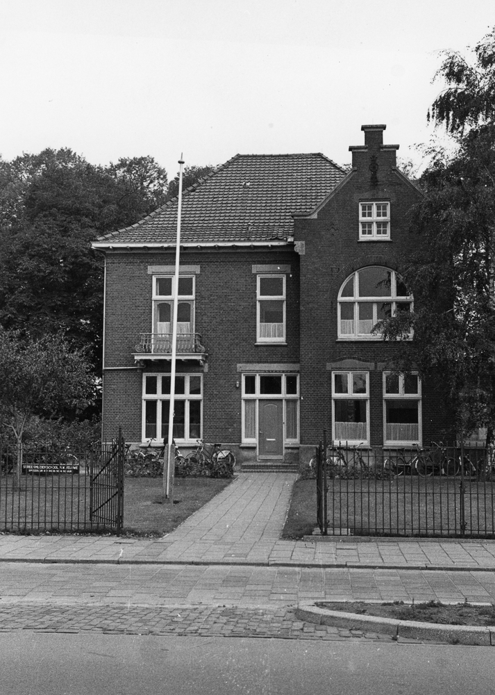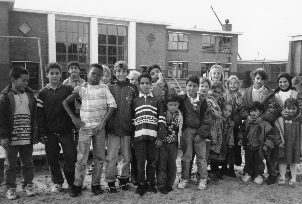 Leerlingen De Delta poseren voor schoolgebouw aan De...