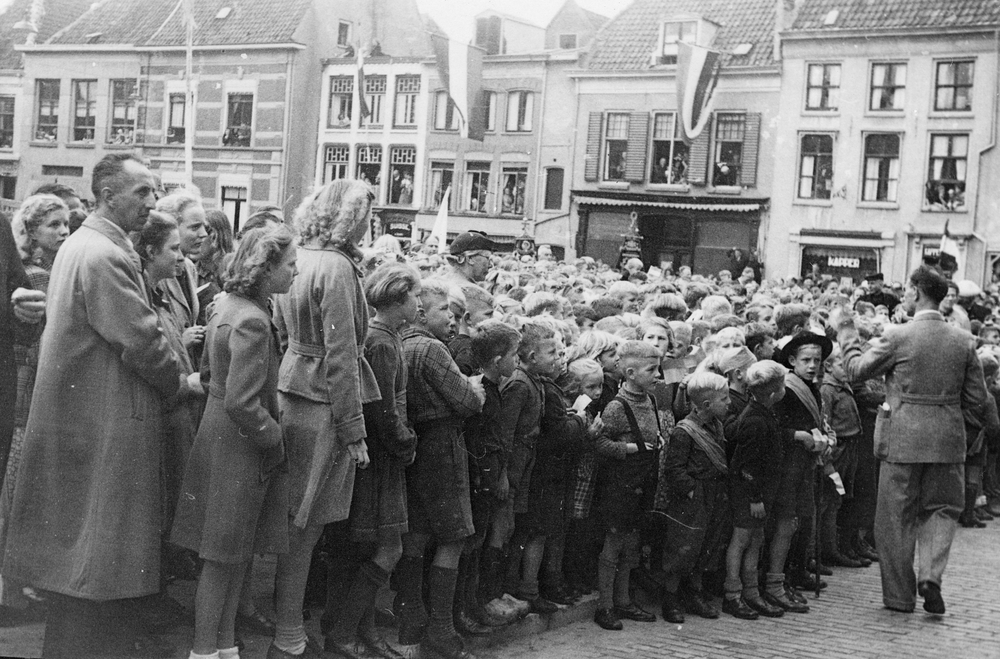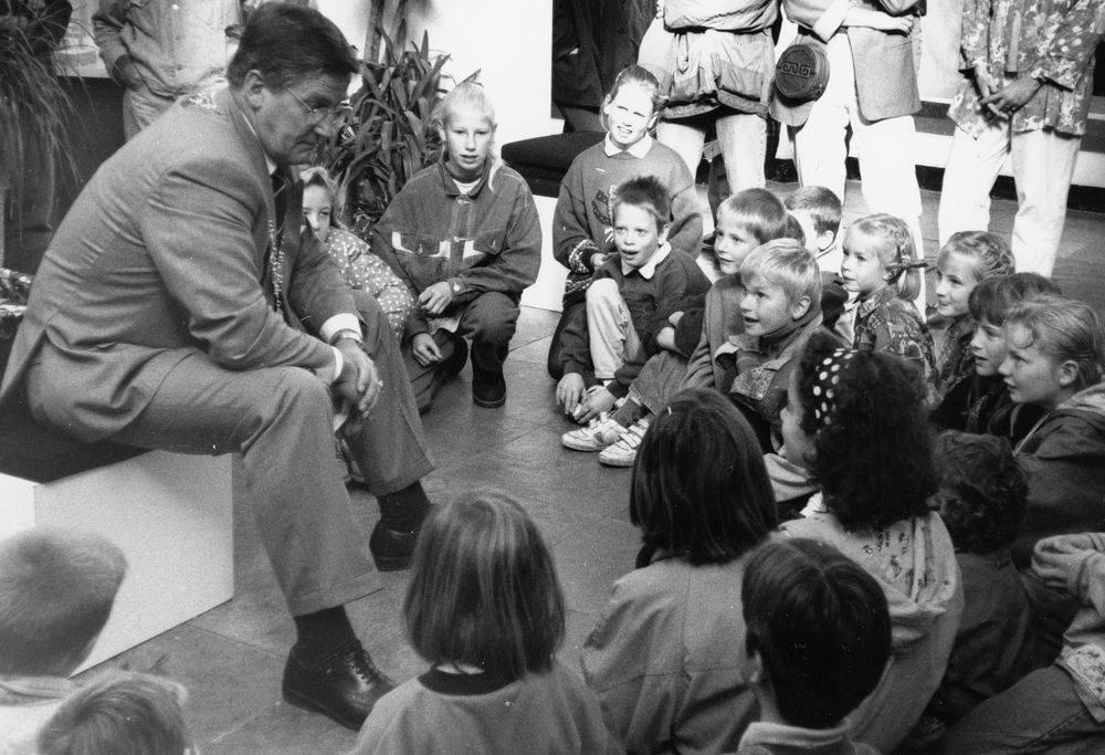Burgemeester J.G. de Groot in gesprek met kinderen o...