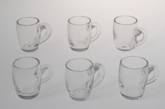 Zes tonvormige miniatuur bierpullen met groot rond oor
