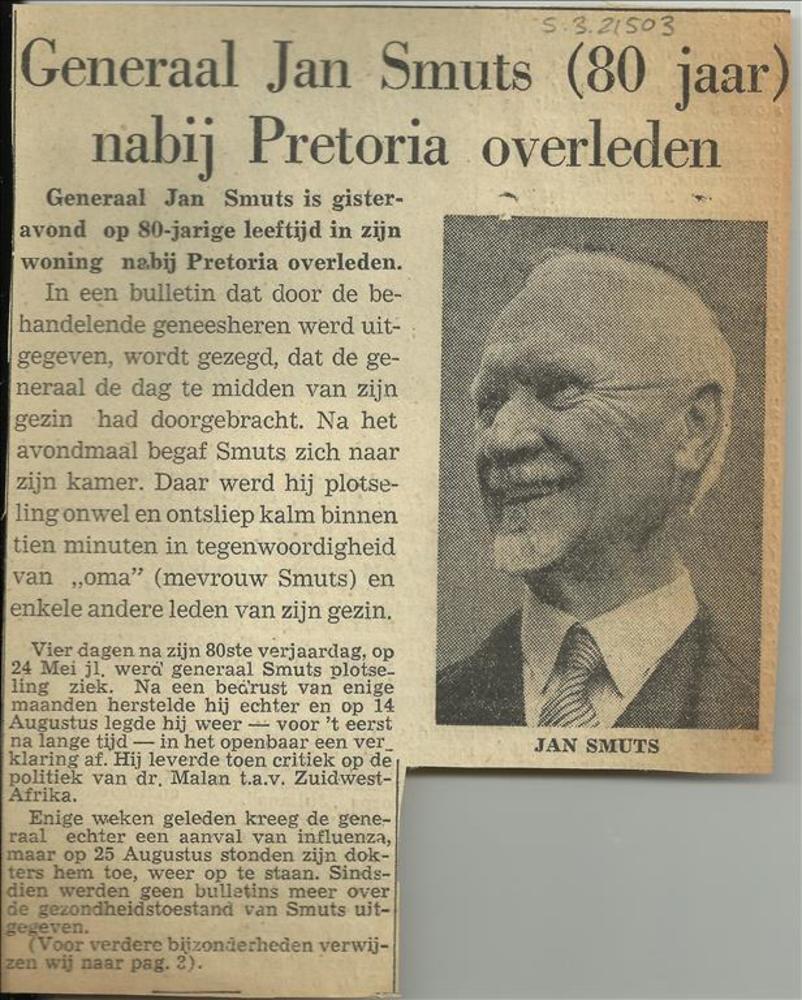 Generaal Jan Smuts (80 jaar) nabij Pretoria overleden