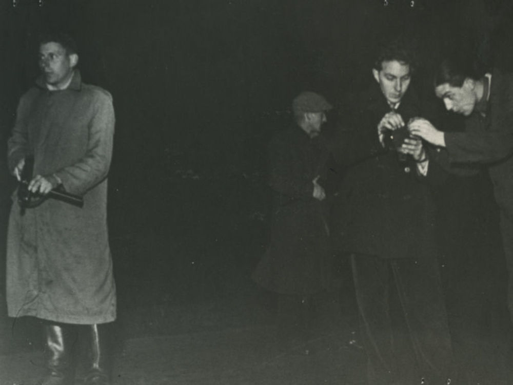 Drie verzetsmensen brengen een springlading aam terw...