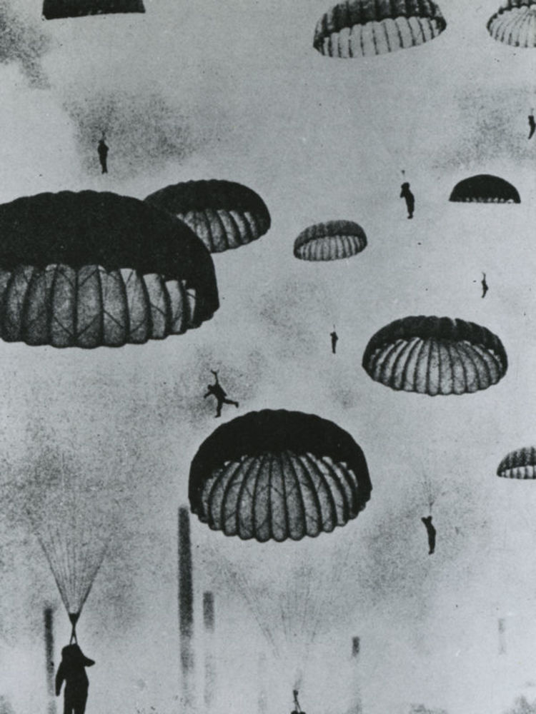 Foto van dalende Duitse parachutisten onder open par...