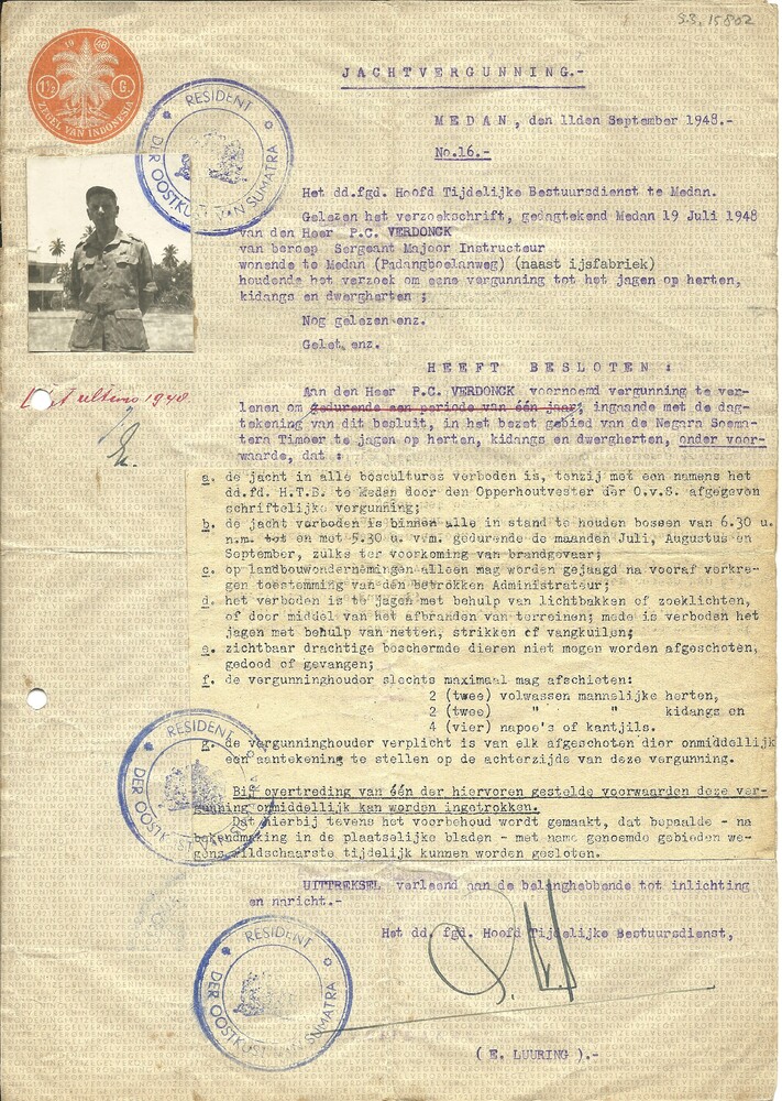Jachtvergunning op naam van P.C. Verdonck, uitgegeve...