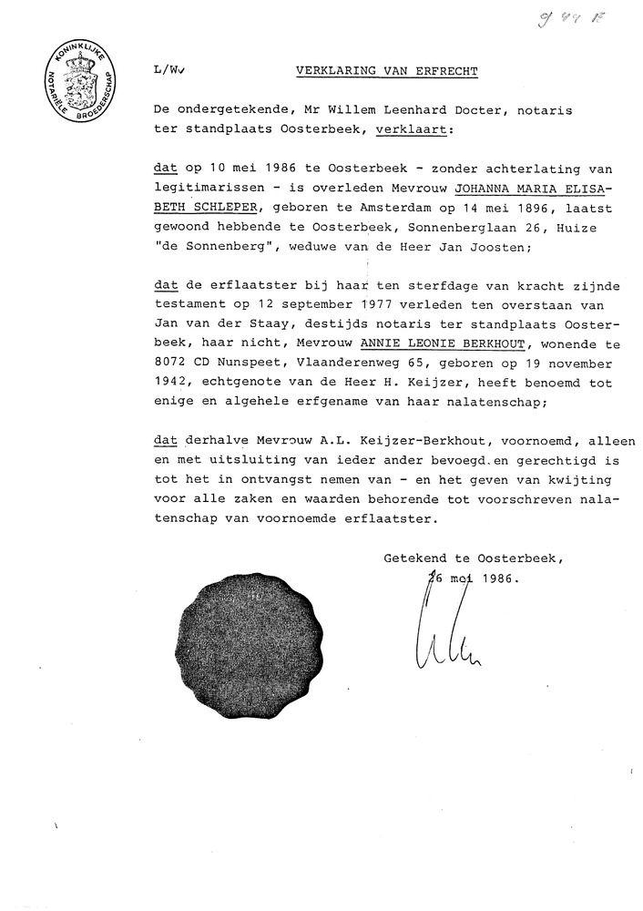 doorslag opsomming op naam van Mr. B.W.F. van de Brand.