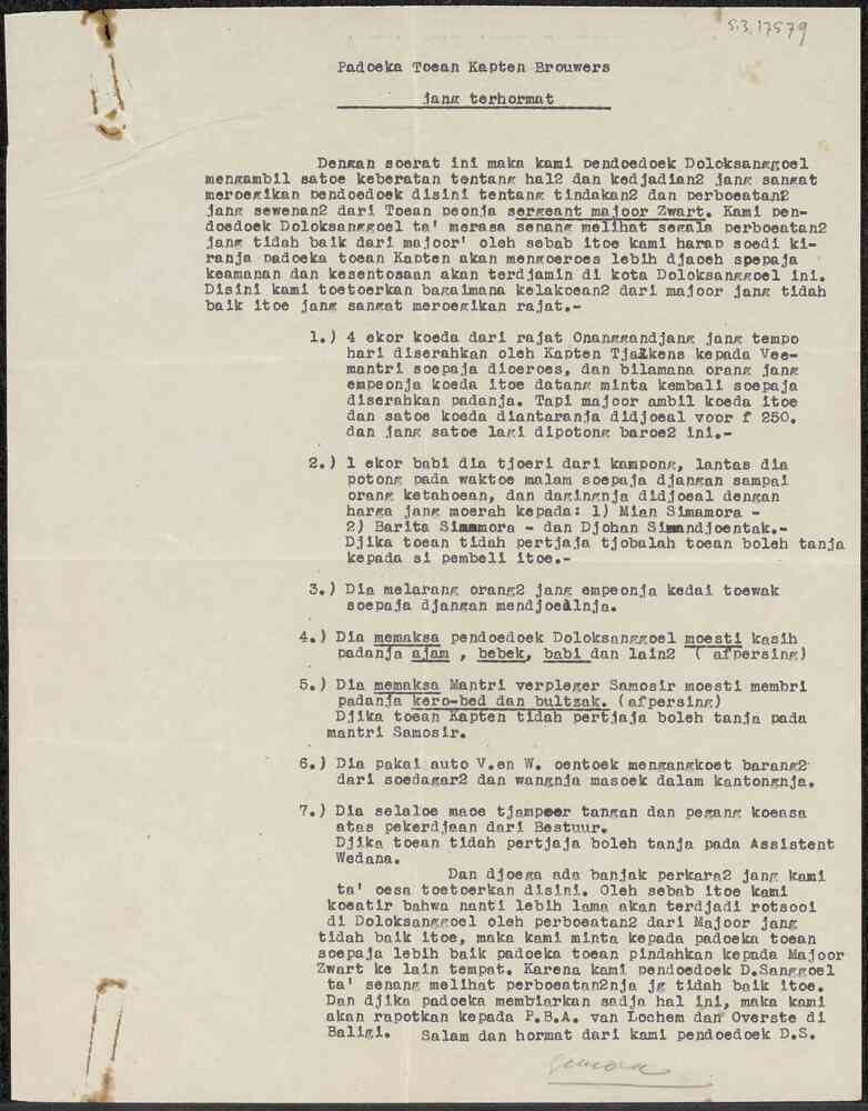 Getypte verklaring in het maleis "Padoeka Toean Kapt...