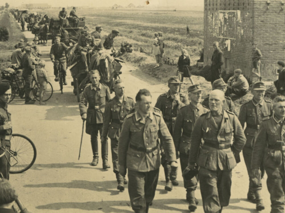 Foto van terugtrekkende Duitse troepen die na de cap...