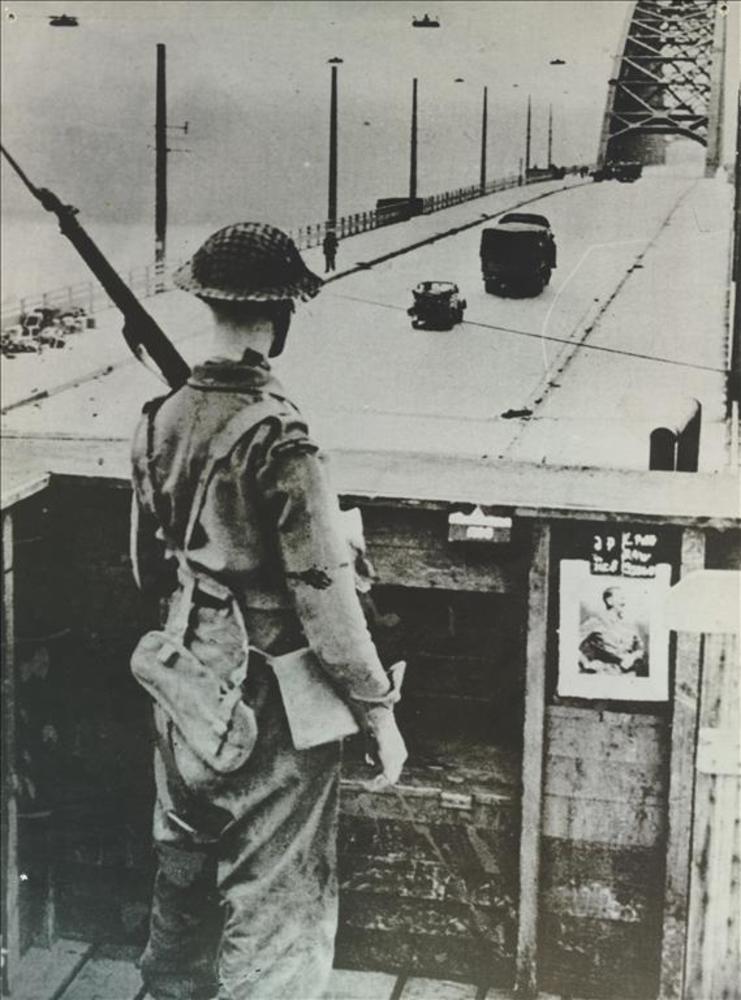 Engelse militair op wacht bij de Waalbrug te Nijmegen