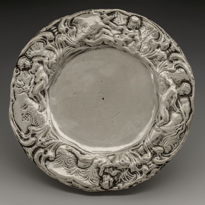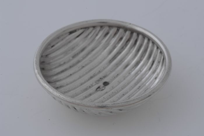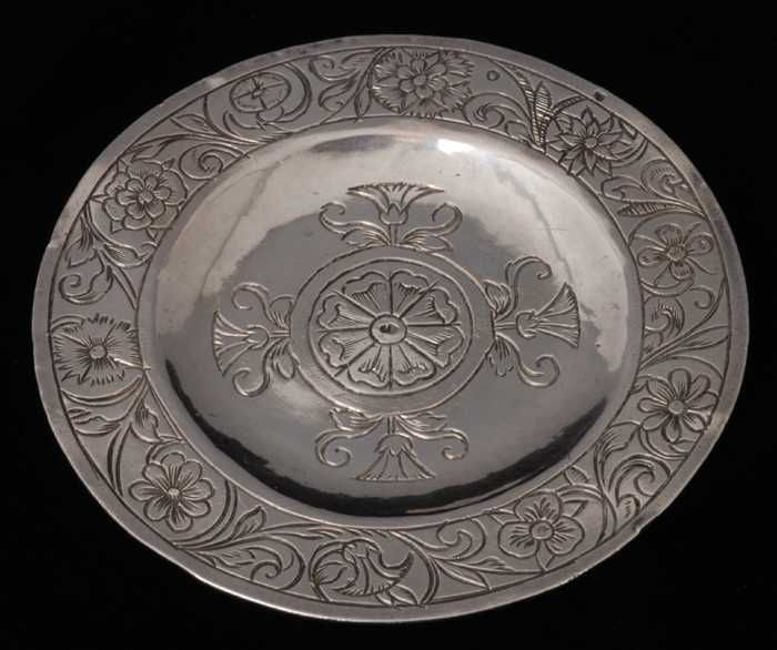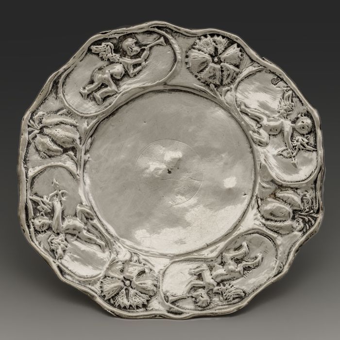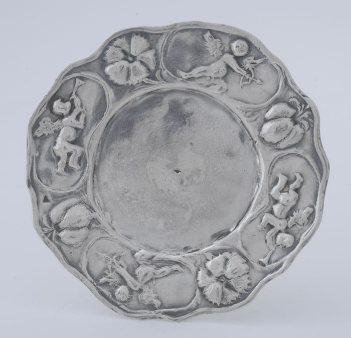 Zilveren ronde miniatuur schotel met engeltjes en bl...