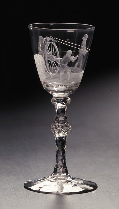 Kelkglas met gegraveerd met lijnbaan en "HET WELDRAI...