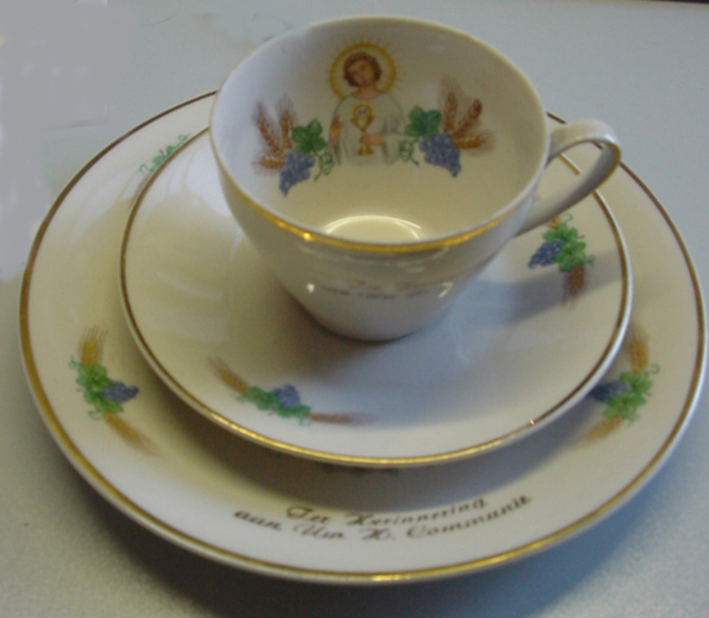Bordje, kop en schotel van aardewerk voorstellende C...