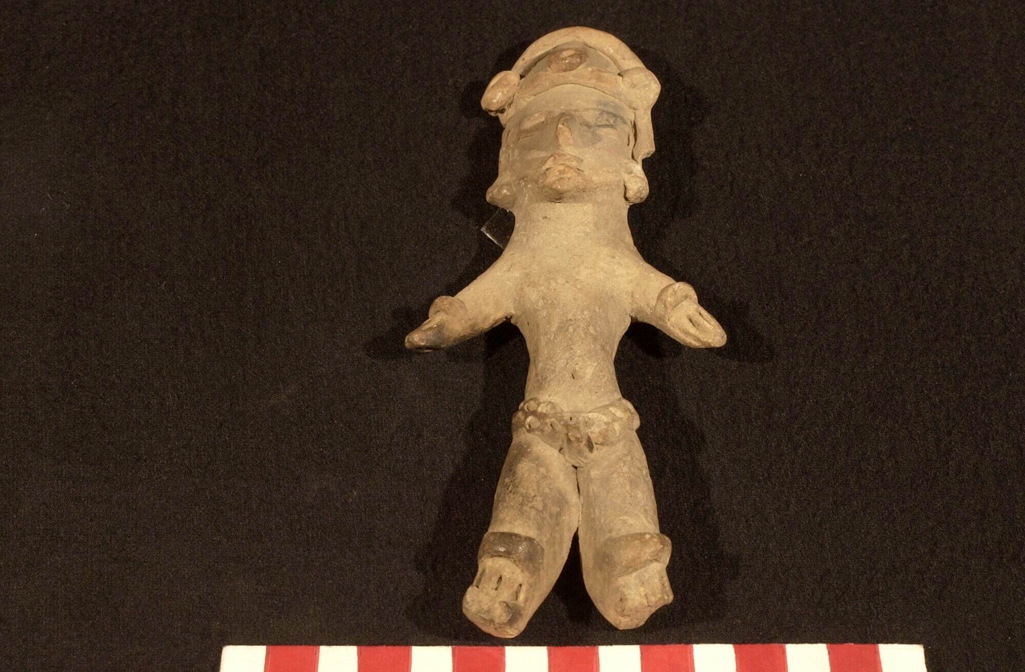 Beeld: een man met een hoofdtooi en maxtlatl