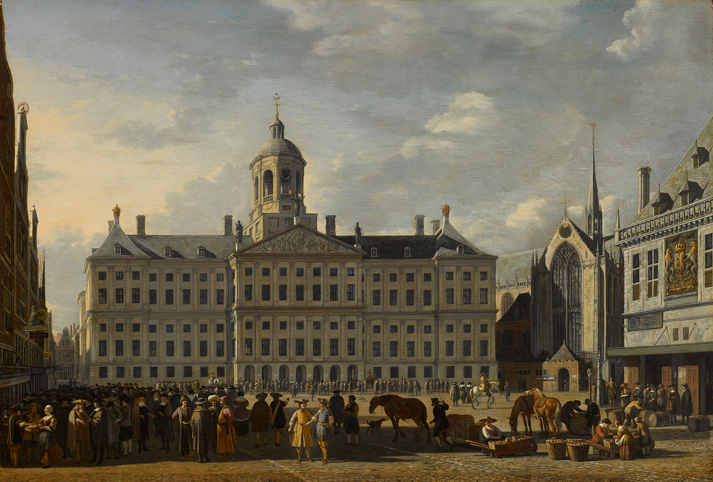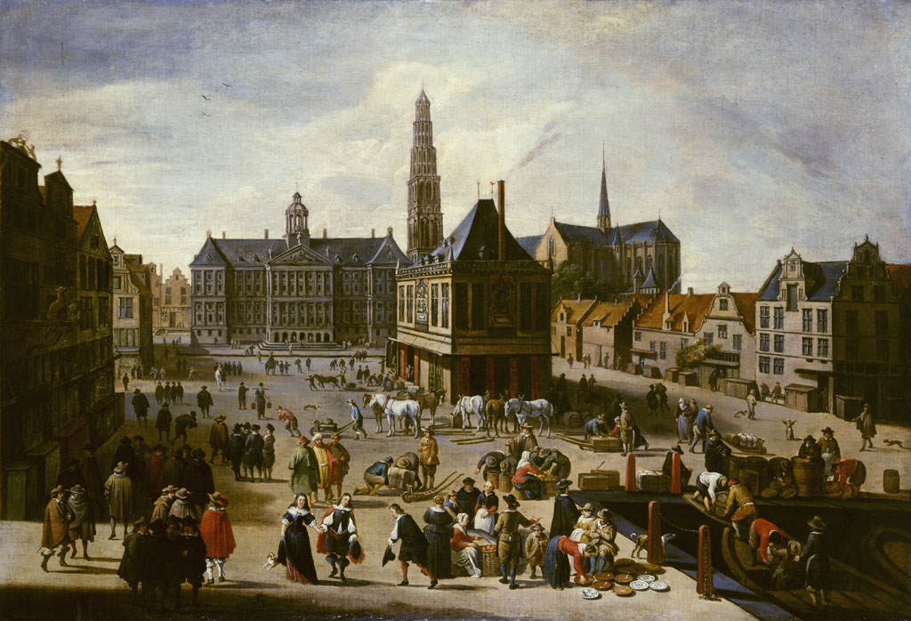 De Dam met het Stadhuis, de Waag, de Nieuwe Kerk met...