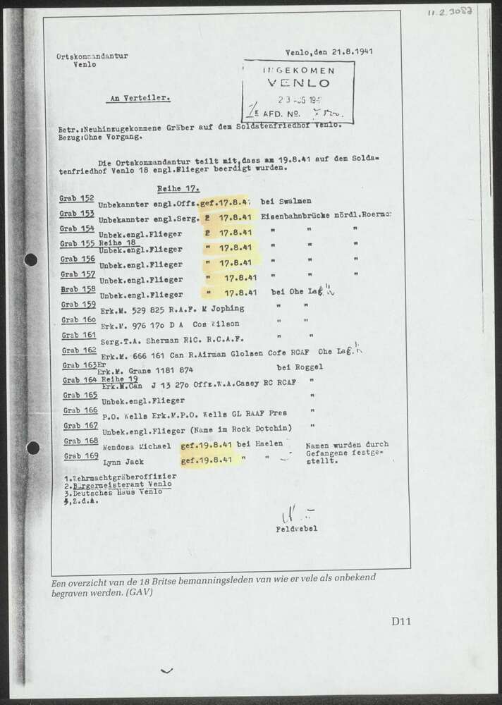 Overzicht van Ortskommandantur Venlo van Britse grav...
