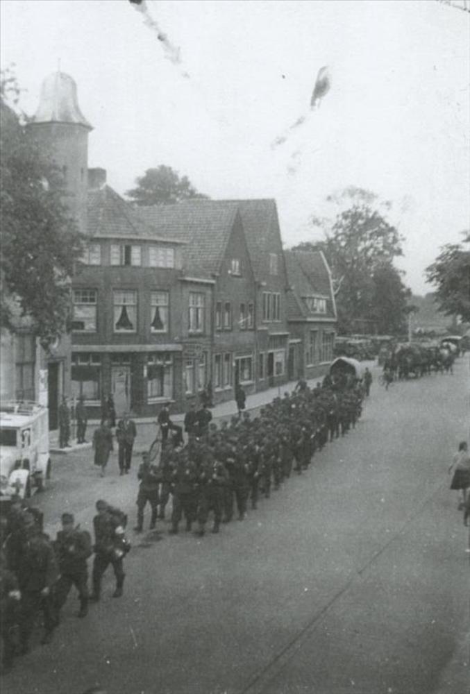 colonne Duitse krijgsgevangenen achter paardenwagens