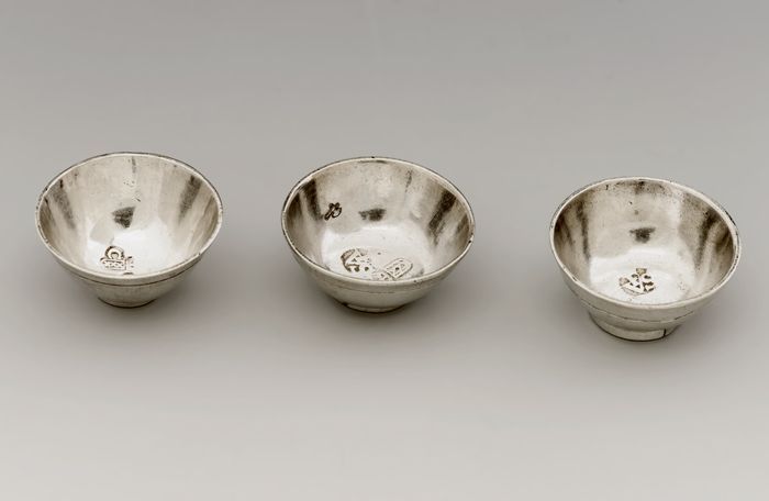 Drie zilveren miniatuur kommen