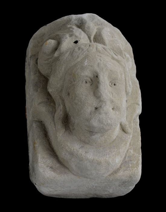 Console met oude vrouwenkop en bladmotieven