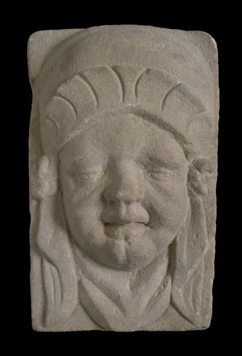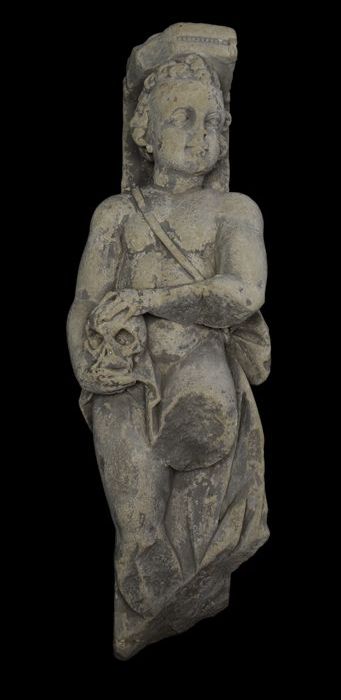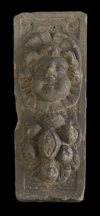 Fragment gevelbeeld, jongen met doodshoofd (pendant ...