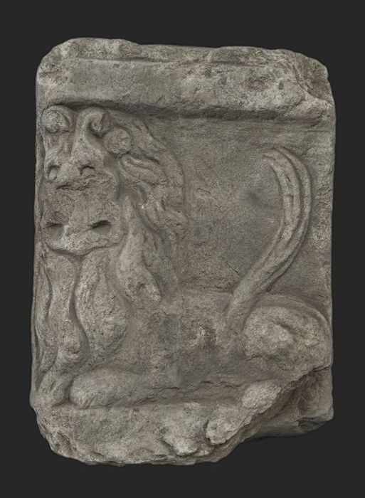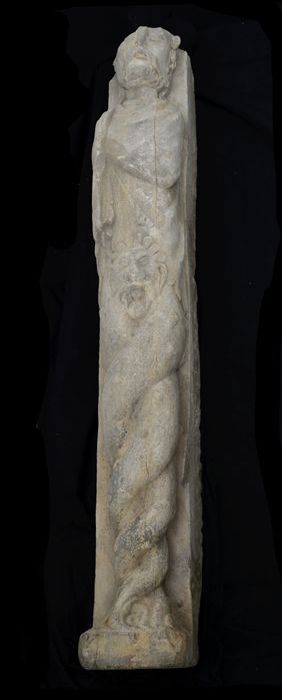Fragment pilaster met staande figuur en leeuw