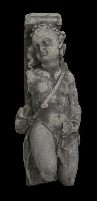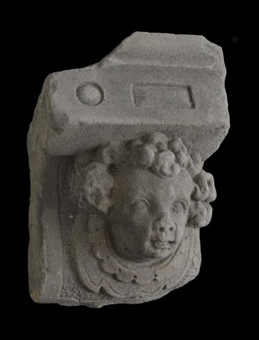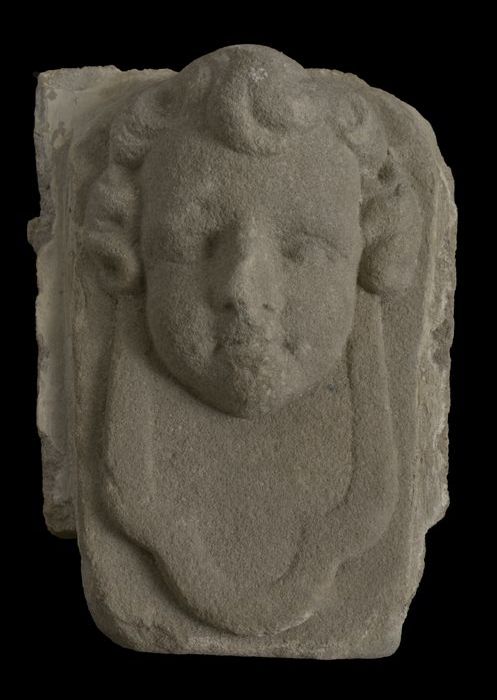 Console, jongenshoofd met krullen en gelobde kraag