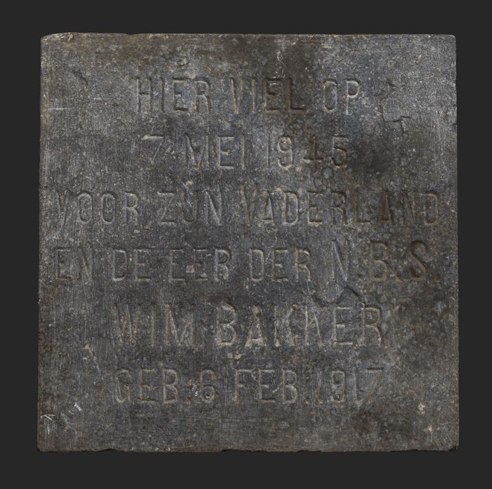 Hardstenen gedenksteen met tekst "Hier viel ... 1945...