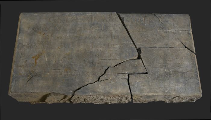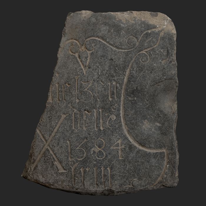 Fragment grafsteen met gotische letters en "1584"