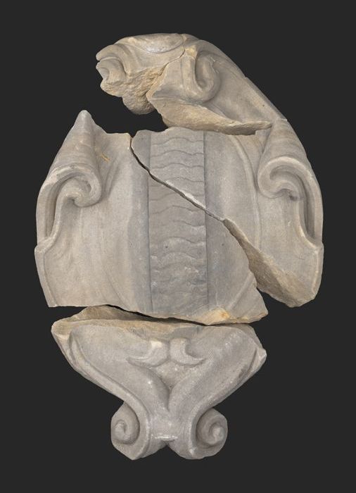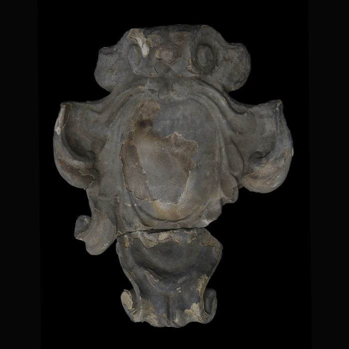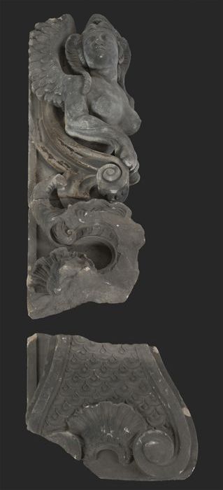 Fragment gevelornament met lijst en krullen