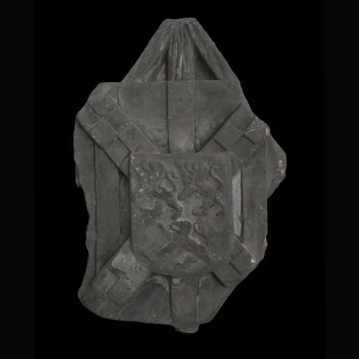 Gebeeldhouwde zittende leeuw met wapenschild, op vie...