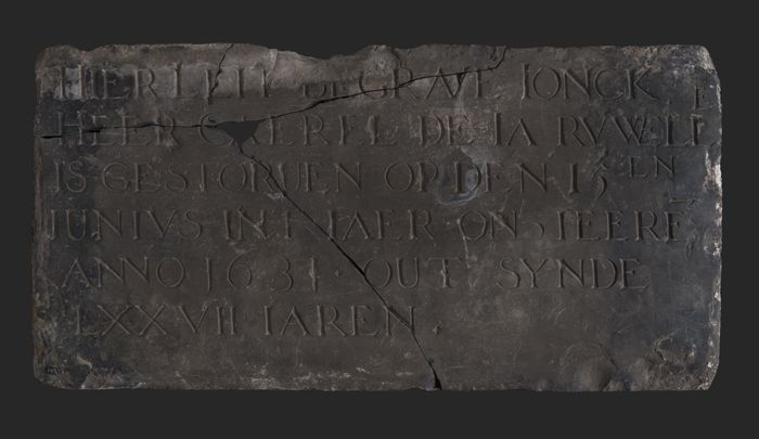 Grafsteen met tekst "Hier leit begrave ... LXXVII ia...