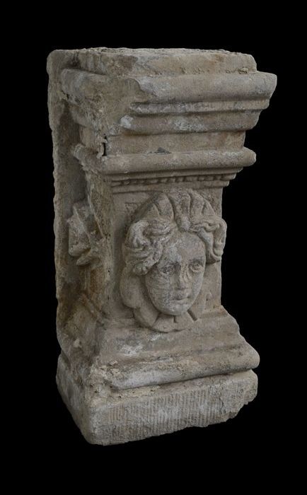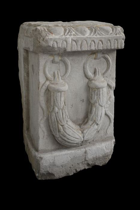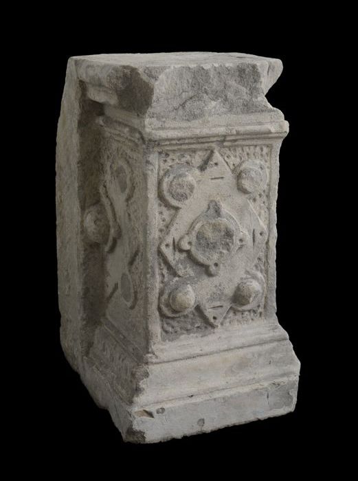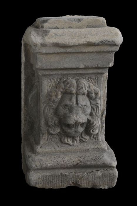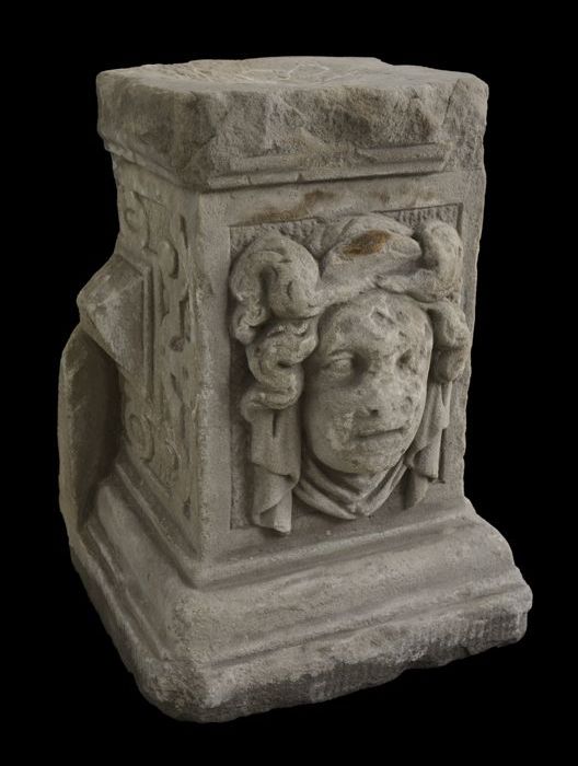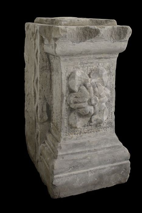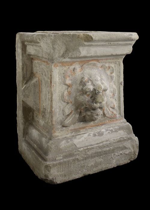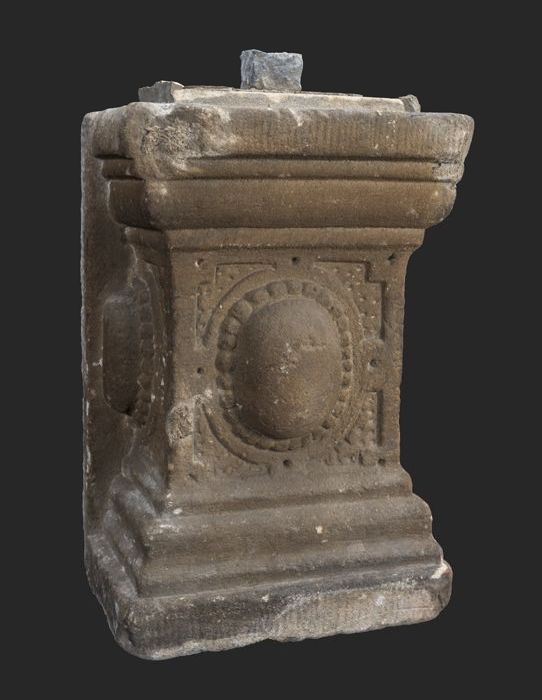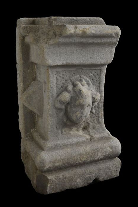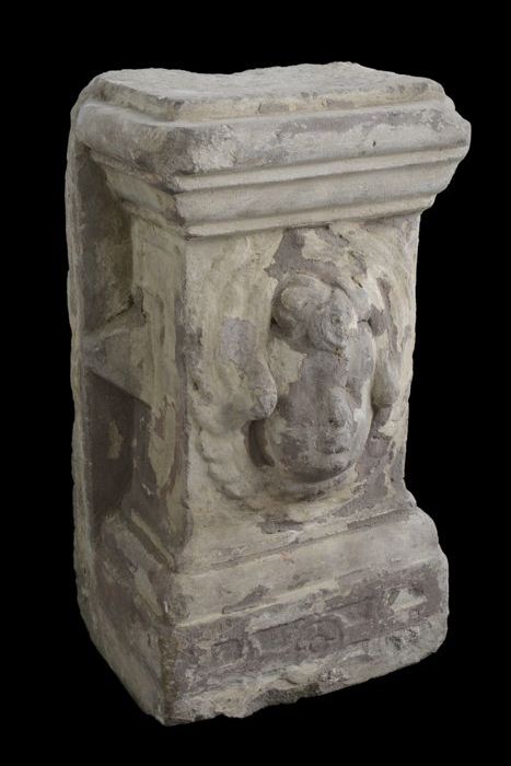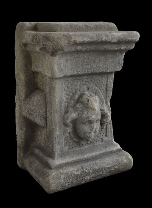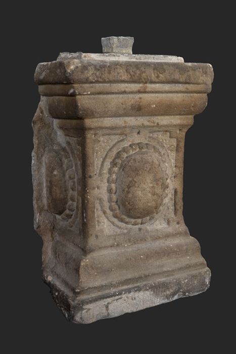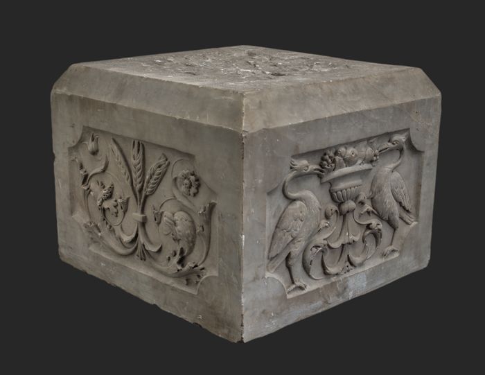 Vierkante steen (basement?) met aan vier zijden afbe...