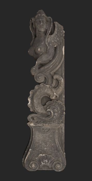 Gebeeldhouwd gevelornament, sfinx op basement, bij 1...