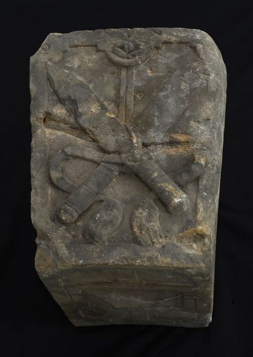 Steen van poort vleeshal, voorkant twee messen, onde...