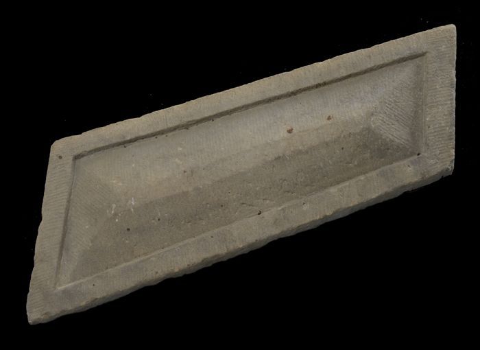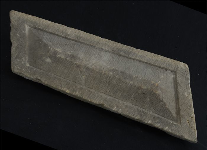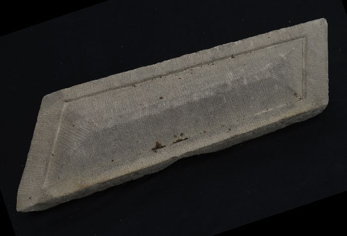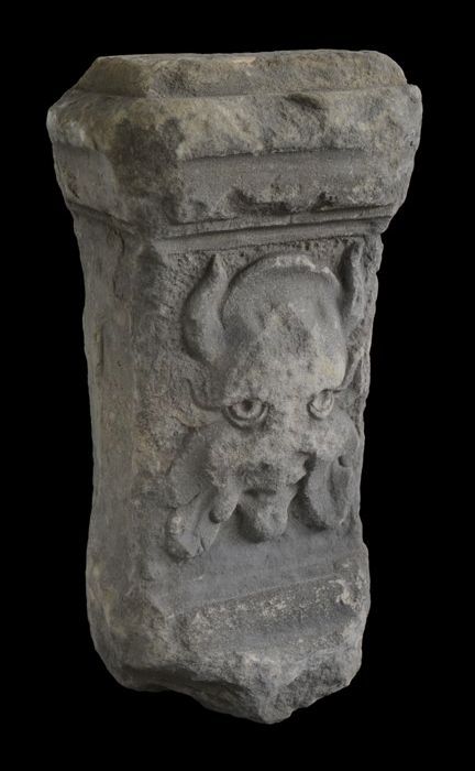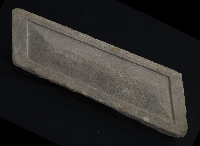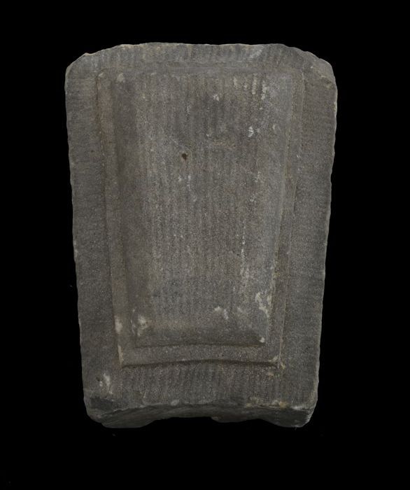Steen van poort vleeshal, voorkant hakblok, onderkan...