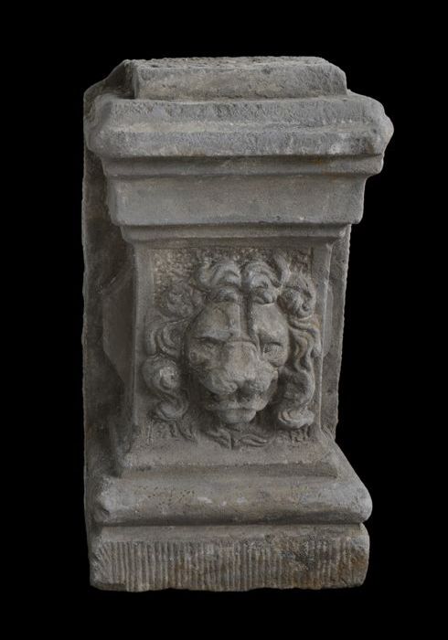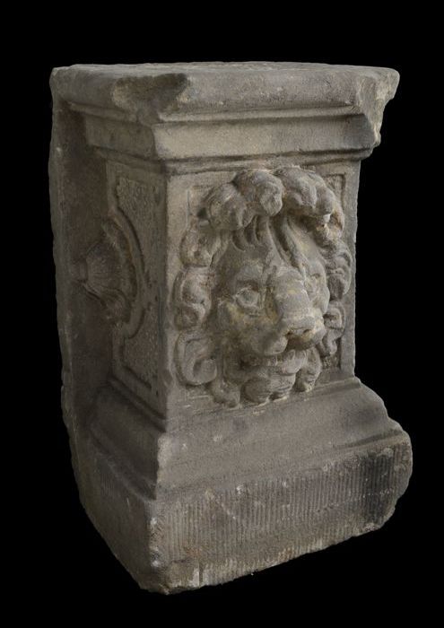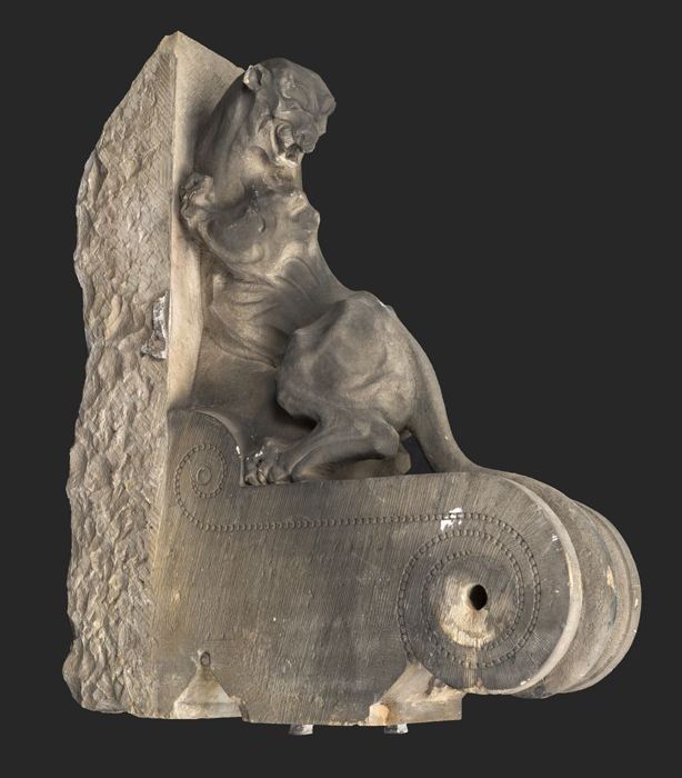 Gebeeldhouwde stenen leeuwin op console (A), met los...