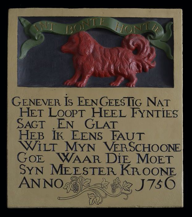 Gevelsteen met in basreliëf hond met tekstlint "INT ...
