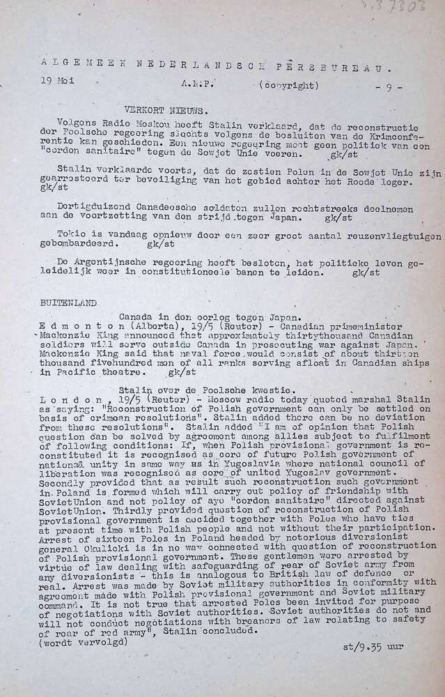 Algemeen Nederlandsch Persbureau, mededelingen, 19 m...