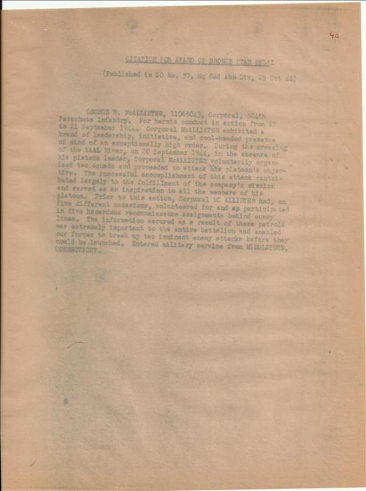 Citation for Bronze Star Medal van George W. McAllister