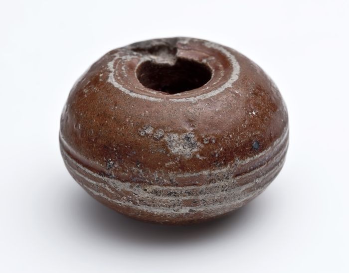 Steengoed kan op geknepen voet, bruine engobe, bol m...